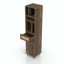 Make a tasteful update to your home with this media tower. The floor-space-conscious design is compact yet functional. Tuck into any corner as a handy five-shelf case for your entertainment room. Two hidden drawers and a cabinet door extend additional storage for small accessories. Elevated on tapered feet and beautified with a cane drawer front, the tower presents a mid-century modern or bohemian style living area.
