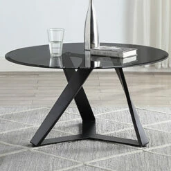 Give your home the appealing look of this contemporary round glass coffee table from Furniture of America. This gorgeous table features a round top made of 8mm beveled glass in a handsome gray. What also catches the eye is the three-legged design with a twist, layered in a textured black powder coated finish. This stunning table enhances the modern look and feel of any home.
