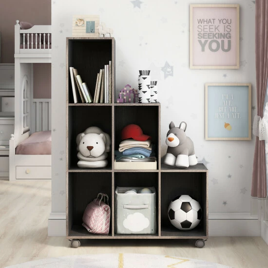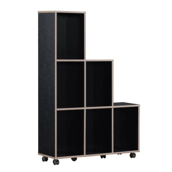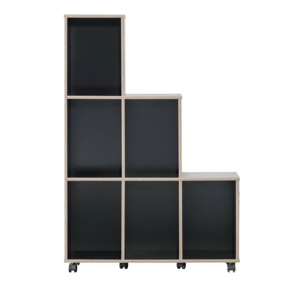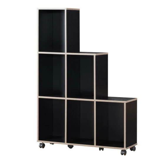 Open storage with a twist, this Contemporary Six Shelf Display Cabinet from Furniture of America features multiple shelves to display your treasures. This unusual tiered staircase design unit has the fixed shelves framed in a light oak accent for visual appeal. Mobile castors make it easy to move this display piece easily from one location to another for design flexibility. The cabinet sports a closed back for stability and each compartment is roomy enough to display even tall books and vases. To give even more design options, this piece is offered in two color options, sold separately. Choose from a dark cappuccino or clean white, both with the light oak trim accents.