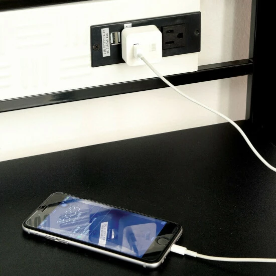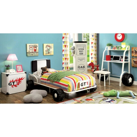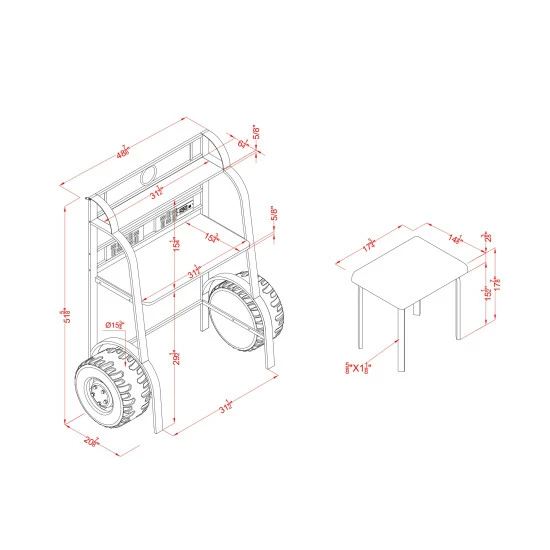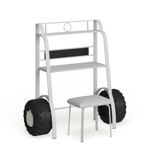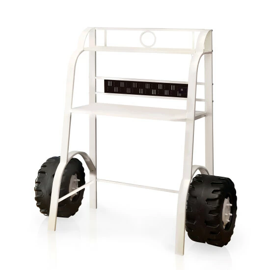 Kick it into high gear and ace those tests with this sporty car-inspired desk station and stool. With a clean, classic white finish, this work station is the perfect place to settle in with homework, reading, or fun arts and crafts projects. Its open design evokes a race car to bring a little adrenaline to a kid’s bedroom space. The desk is built with sturdy metal framework and is accented with life-like large, black wheels. The sleek open structure offers ample tabletop space for a book and papers while an upper shelf is just the place to show off trophies and other fun decor accents. The back of the desk is accented with a useful power station delivering electrical and USB outlets for easy access.