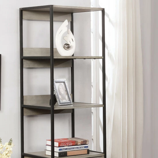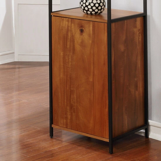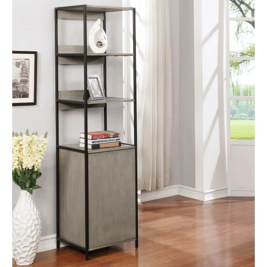 Storage and display needs are well covered with this three-tier bookshelf with tall cabinet base. Stylishly made by Furniture of America for the Soby collection, the acacia wood panels in a rich finish are supported by a sleek metal frame . It boasts a powder coated, durable finish that makes it a wonderfully attractive bookshelf. Spacious shelves allow you to display and highlight your favorite decor items and book collections. Made from MDF and veneer, this piece is finished in a natural or grey color that blends with your existing decor. The sleek and solid base adds extra aesthetic appeal while blending with the rest of the three-tier bookshelf.