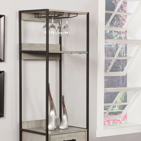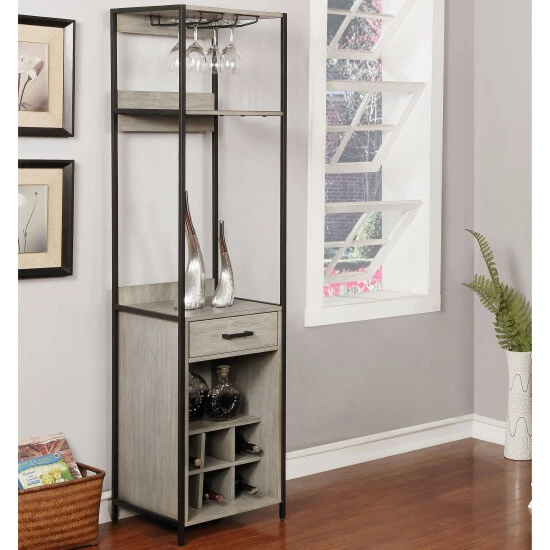 The Soby transitional wine rack offers a tempting solution to challenges inherent with space limitations. This win rack from Furniture of America offers a spirited design and handy space-saving efficiency with a tall profile, and becomes a perfect blend of old and new with a linear silhouette. Made of wood and veneer, its lower cabinet unit, upper shelf, and wall supports balance a tasteful palette with a deep finish powder coated metal frame. Find storage space on three shelves and in a single drawer, and dedicated storage for six standard-size wine bottles in a linear cubby configuration. A hanging stemware rack keeps glasses on the ready for instant service.