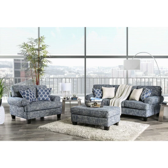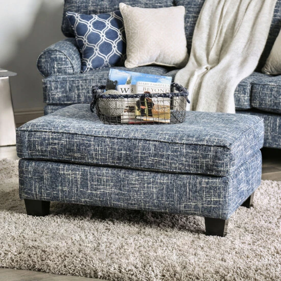 Give your living space a colorful and inviting update with the Furniture of America Sorz ottoman. This stylish, rectangular ottoman features a textured weave upholstery and bold, blue-grey colors that will instantly add a dash of liveliness and cheer to any living room. This ottoman’s beautiful dark toned wood legs support the sturdy, solid wood frame for superior durability and strength. The seat is covered with pocket coil springs and high density foam for the perfect level of comfort. Made in America with quality construction and materials, you and your loved ones will enjoy this contemporary ottoman for years to come.
