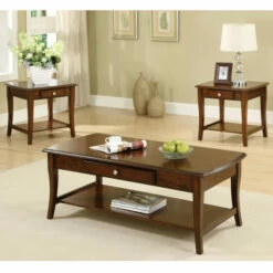 The Sova transitional oak accent table set offers three pieces that embellish a custom transitional living space. This set from Furniture of America adds a romantic upgrade with functional and fashionable tables designed to store and display, and anchor a seating ensemble in a living room or family entertaining space. Built from solid wood, each table receives a lush dark oak finish delivering versatility and infusing warmth. Flared, tapered legs and beveled ridge tabletops form a romantic silhouette, as slender drawers on table aprons offer essential storage space. Lower shelfs add even more space to display periodicals. Center drawers with polished metal knobs complete a list of features turning this delightful set into a classic. Set features a rectangular coffee table and two rectangular end tables.