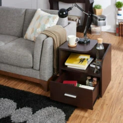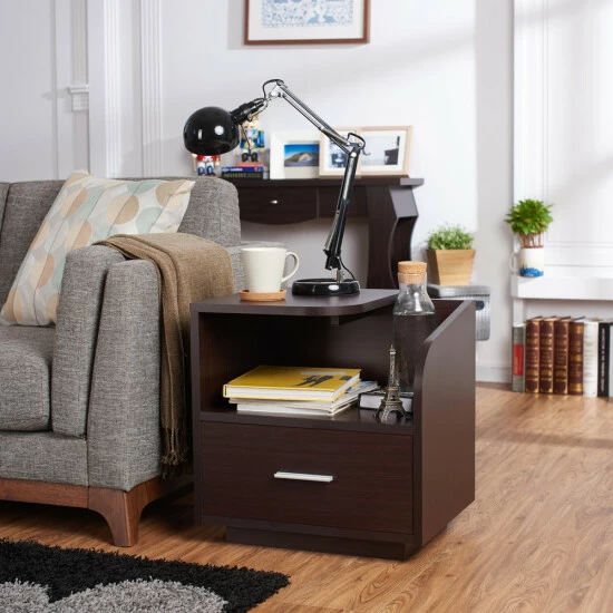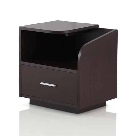 The spectacular Sove End Table from Furniture of America delivers a smooth modern style with a curving side and rounded panel top. The semi-round shelf gives the perfect spot to place a table lamp within close reach. Use the open shelf to store items and display decor while the exposed top provides easy access to the shelf. The single drawer features a sleek chrome pull and ample storage. Keep magazines, books and controllers organized for a clutter-free living space. Finished in a wonderful walnut color with a wood frame, the slim coffee table offers appealing design and spacious storage functionality.