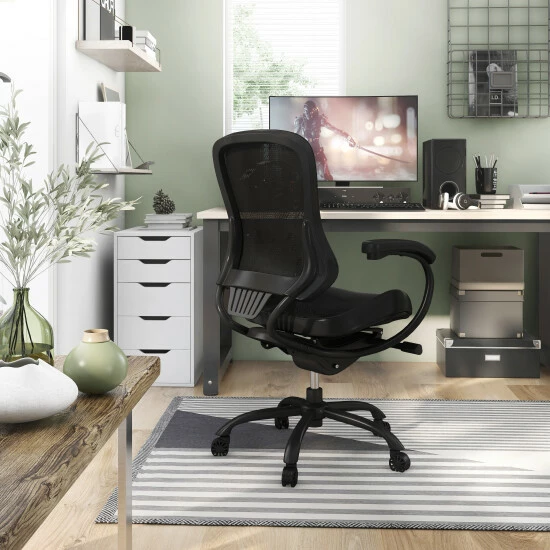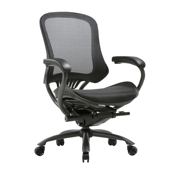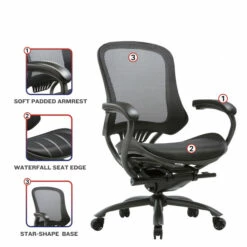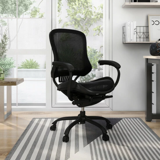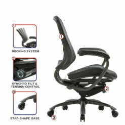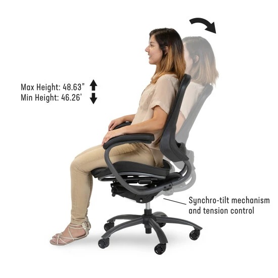 The synchro tilt mechanism with tension control is a high-end ergonomic desk chair. This design allows the seat and back to move at different angles with a 2:1 ratio, where the back may move two inches and the seat tilts up one inch. It helps keep you in an ergonomic position throughout your recline without lifting your feet off the ground. A rocking system and waterfall seat edge add comfort.