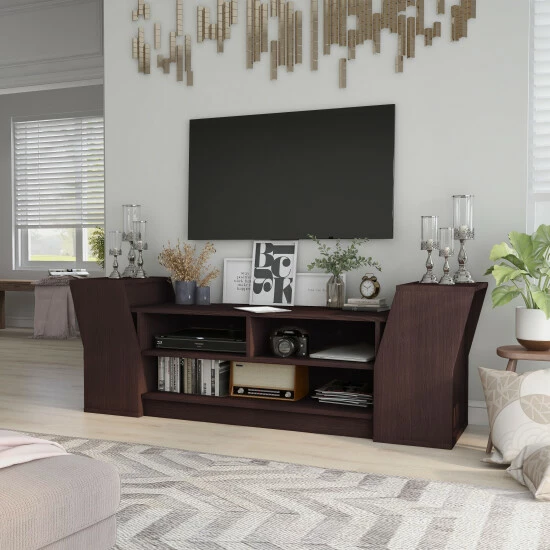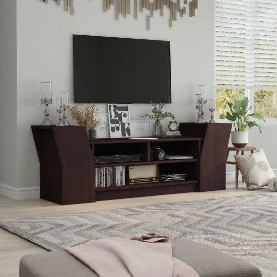 Reinvent your living room into your media room with this versatile Tai Contemporary TV Stand. With a narrow footprint and compact size this entertainment center from Furniture of America can hold your technology and media devices without taking up too much space. The modern linear design of this TV stand console has multiple storage areas to keep your audio video components organized and your living space uncluttered. Boasting two cabinets to stow belongings and open shelves to showcase books and other items, this piece, offered in multiple finishes, is sure to be a striking focal point in your living room or home theater room.