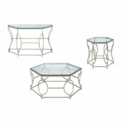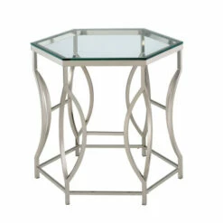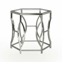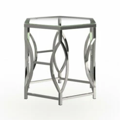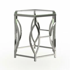 Sleek and entrancing, this geometric yet stylish accent end table in chrome is a beautiful design by Furniture of America for the Talm collection. With its eye-catching geometric frame and alluring color combination, it will fit into any contemporary home. With its unique hexagon shape, the chrome frameworks sturdily uphold the tempered glass top while adding beautiful shine. The attractive frame features an oval pattern that highlights the architectural features of this chrome end table. This piece is made from durable metal and glass, working in transitional style living areas that need a modern or contemporary twist in the home.