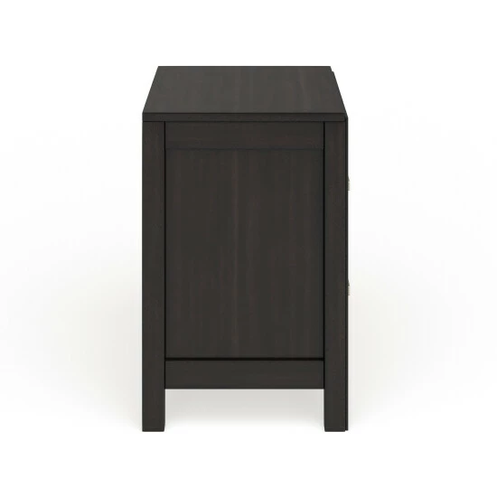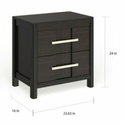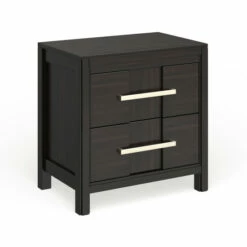 Update your bedroom in a sleek way with this solid wood nightstand. Layered panels on two drawer fronts create a unique design element for visual interest and the wide slim drawer pulls keep things sleek. Metal handles and a wide top to place a lamp, clock, and electronics.