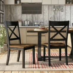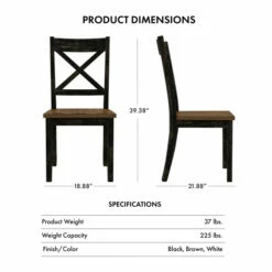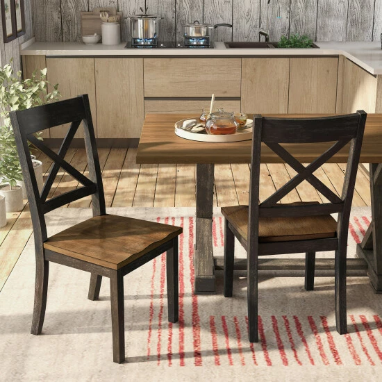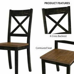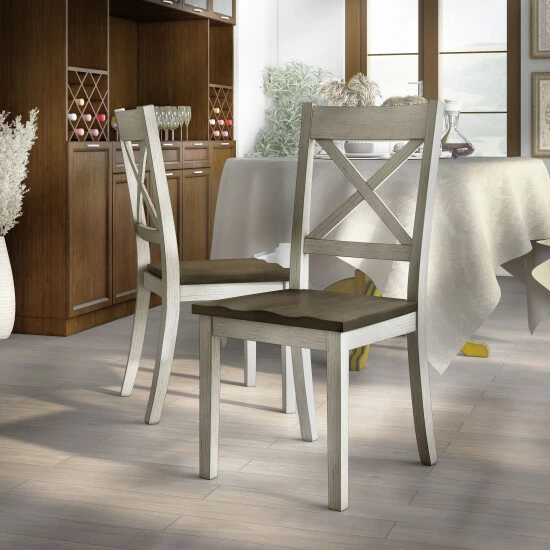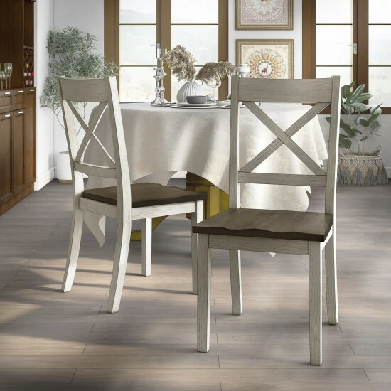 Reimagine your eat-in kitchen or dining room with casual farmhouse flair with this set of two rustic dining side chairs. The set delivers a two-tone finish with wood grain, contoured seats for optimal comfort paired with charming X-cross open backs.