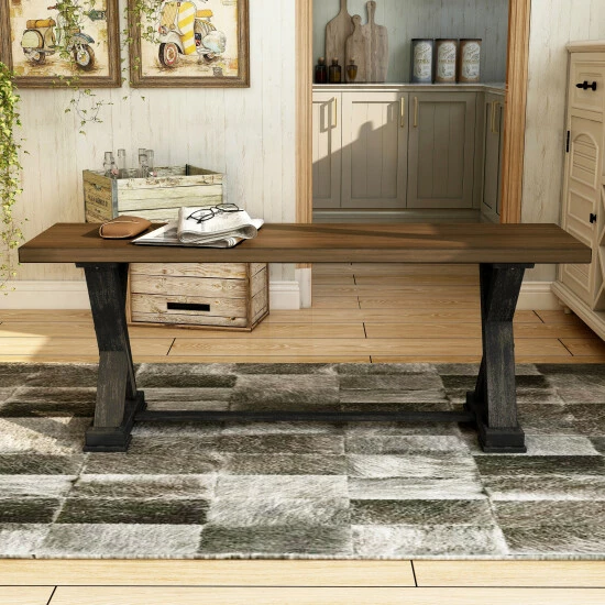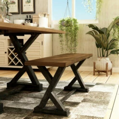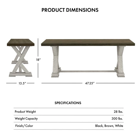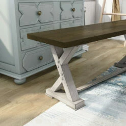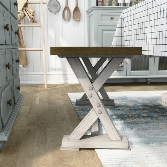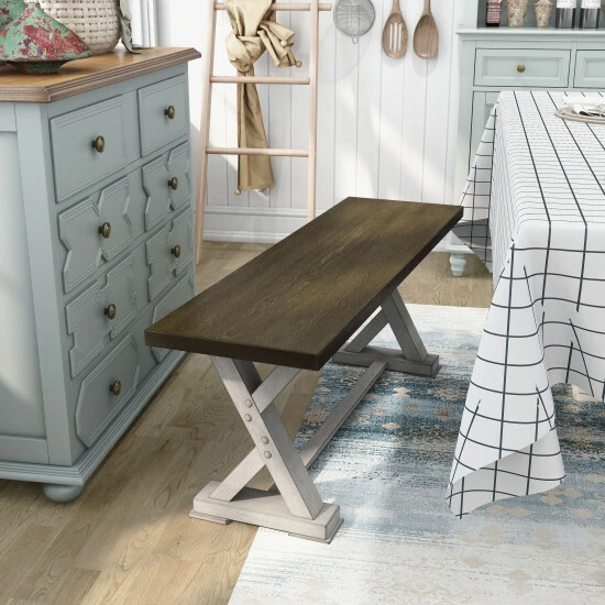 Reimagine your eat-in kitchen or dining room with casual farmhouse flair with this rustic dining bench. The bench design delivers a two-tone finish with a long, flat seat in a classic wood grain finish. A trestle base adds character to your table.