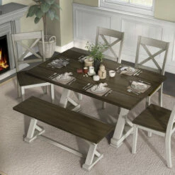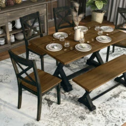 Reimagine your eat-in kitchen or dining room with casual farmhouse flair with this six-piece dining set with a bench. A flip-top table features a trestle base while chairs feature X-backs. The set delivers a two-tone finish with wood grain tabletops and seats.