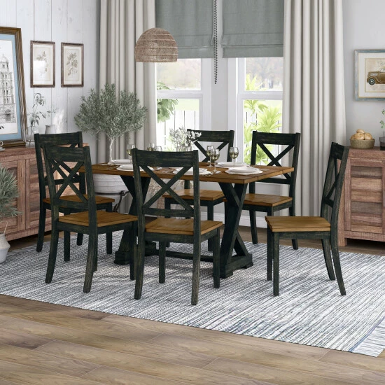 Reimagine your eat-in kitchen or dining room with casual farmhouse flair with this seven-piece dining set. A flip-top table features a trestle base while matching chairs feature X-backs. The set delivers a two-tone finish with wood grain tabletops and seats.