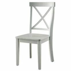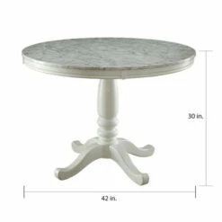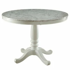 Lovely breakfasts sitting in a sunny kitchen are made all the more glorious with the fabulous, friendly design of this dining set. Soft white graces solid wood and faux marble for a delightful blend of materials that offers glamor and interest. A pedestal base flares beautifully from the table, complementing contoured wooden seats and a cross back design for quaint country vibes designed to last.