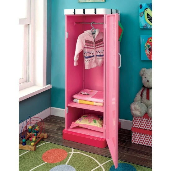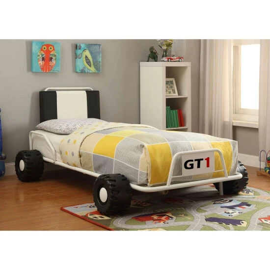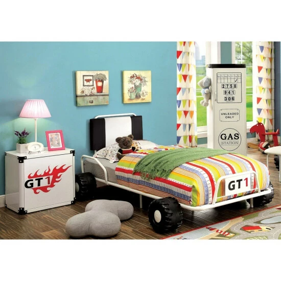 Delight any child with this race car themed three-piece twin bedroom set. The twin bed features realistic plastic wheels and the frame is solidly constructed with metal components for stability and durability. The headboard has a striped design and is padded for comfort. A metal nightstand offers two shelves within to keep clutter at bay. The charming gas pump inspired closet features two interior shelves and a hanging rod that makes for easy-to-reach organization.