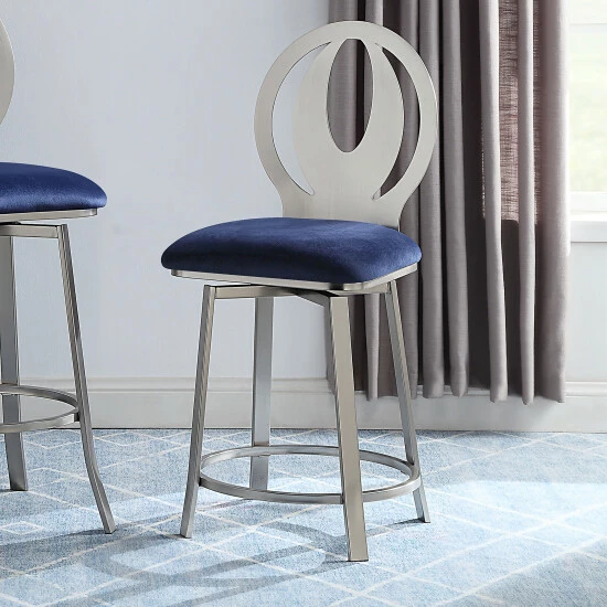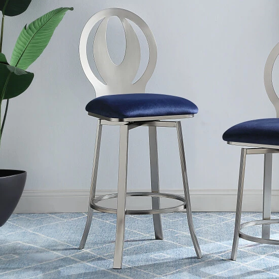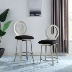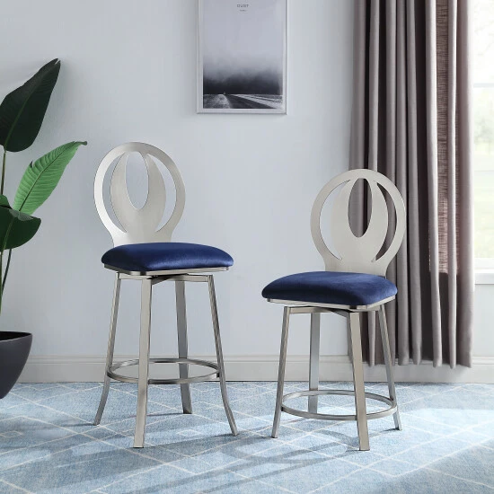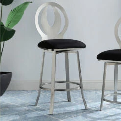 Give your dining or entertainment space a fun, glamorous look with this contemporary padded seat swivel barstool set from Furniture of America. It features a steel frame construction in a gleaming satin plated finish that lights up any room. The plush seat has a microfiber padding that makes sitting for any occasion comfortable. The oval seat back has an open, airy design that makes a statement, while the legs slightly flare and include a convenient round footrest.