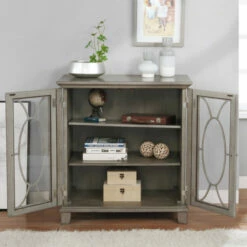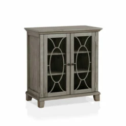Create stylish storage and display opportunity in any room with this lovely transitional hallway cabinet. Boasting glass doors with oval overlays that add a decorative touch, the grey cabinet is right at home gracing an entryway, hall, or other transitional space within the home. The interior of the cabinet includes three shelves for books, boxes, and all manner of other items. Simple hardware and classic trim add a polished finishing touch.