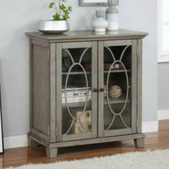 Create stylish storage and display opportunity in any room with this lovely transitional hallway cabinet. Boasting glass doors with oval overlays that add a decorative touch, the grey cabinet is right at home gracing an entryway, hall, or other transitional space within the home. The interior of the cabinet includes three shelves for books, boxes, and all manner of other items. Simple hardware and classic trim add a polished finishing touch.