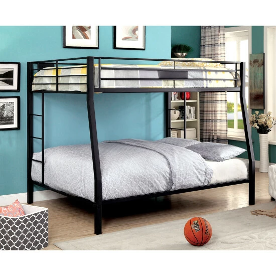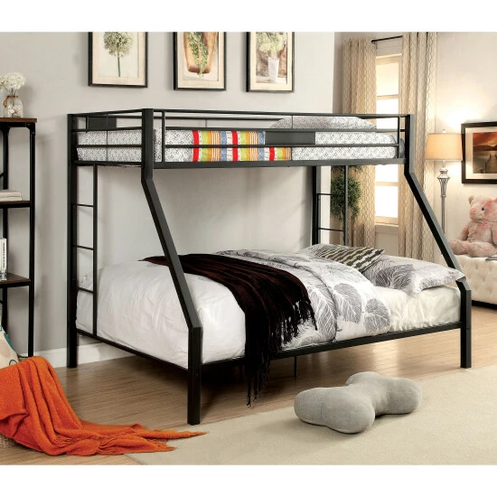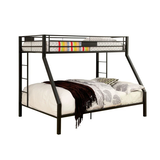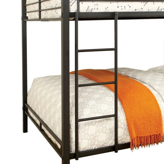 This stylish, streamlined bunk bed features full metal construction, with clean straight lines blending with slightly angled ones in a classic black finish. It also includes two attached ladders for convenient up and down access to and from the top bunk with safety guardrails on all sides. The sturdy metal bed posts also offer support and a bold silhouette that stands out in any bedroom.
