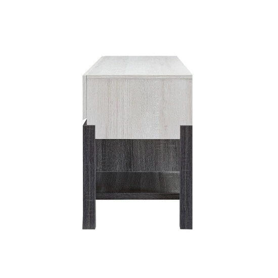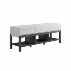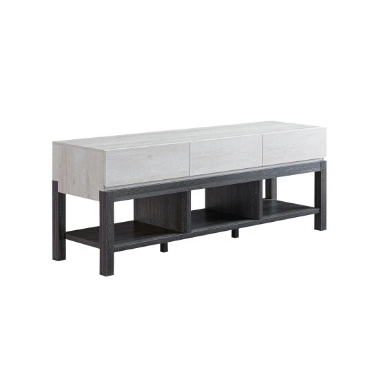 Eye-catching in a combination of white oak and distressed grey finishes, this modern TV stand creates a calm, welcoming ambiance in your living room. Its darker open base features three open compartments perfect for media components, storage, and display. On top, three light and bright drawers create a spot to stash everything from games to accessories.