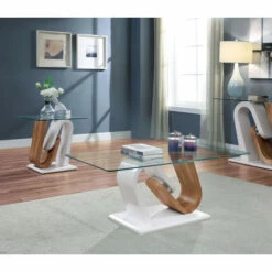 Rejuvenate a tired space with these two sculptural-style accent tables, made for the terrific Tong collection. This two-piece table set features curving elements at the base that provide a modern two-tone design in your living space. The base is made from wood with high-gloss white and natural wood finishes for contrasting beauty. Tempered glass tops provide a smooth, and stable spot to place items while letting the decorative bases show through clearly. Incredibly sleek and sophisticated, this set provides an artful display in your living area all while serving as a functional set, working with transitional style rooms.