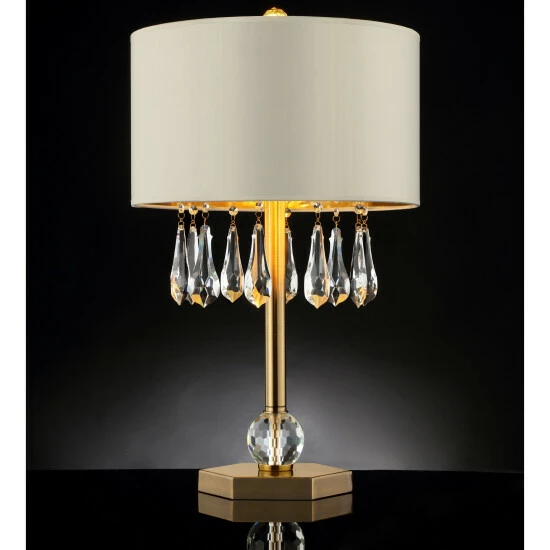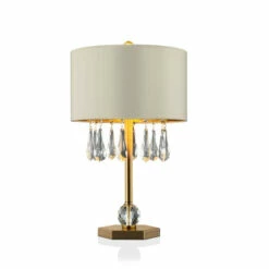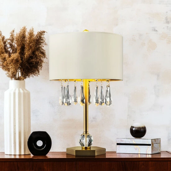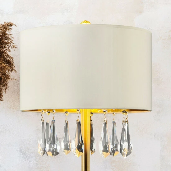 This opulent contemporary table lamp shimmers and gleams from an array of luxurious tones and motifs. Long crystals hang low from the ivory shades, while the gold stem features a dazzling crystal ball and cool hexagonal base for a lamp that will light up your living or sleep space in more ways than one.
