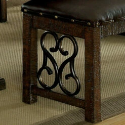 Elevate your dining space with the rich, regal design of this Furniture of America dining bench. A traditional style dining bench with medieval undertones, this one of a kind piece showcases scrolled metal work with complementing espresso faux leather. The plush, padded seat is crafted with luxurious foam filling for cloud-like comfort and a cozy, relaxing dining experience. Elegant nailhead detailing adds an alluring hint of shine to this tasteful and timeless piece. Straight leg supports are reinforced by an extra support beam for added stability. The simple wooden frame is finished in rustic walnut for a cozy, weathered look that oozes classic charm.