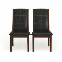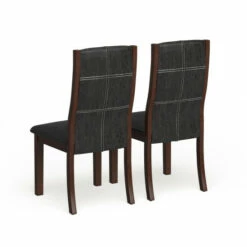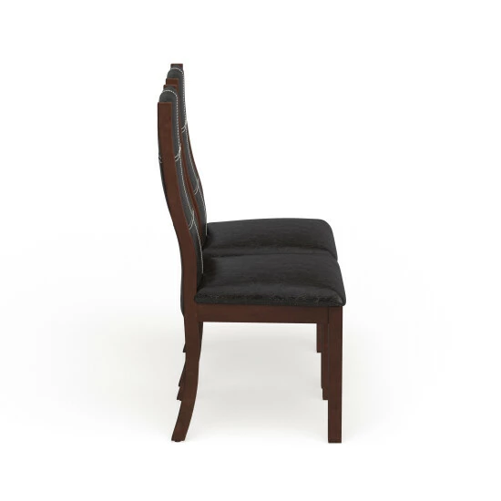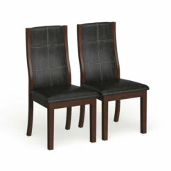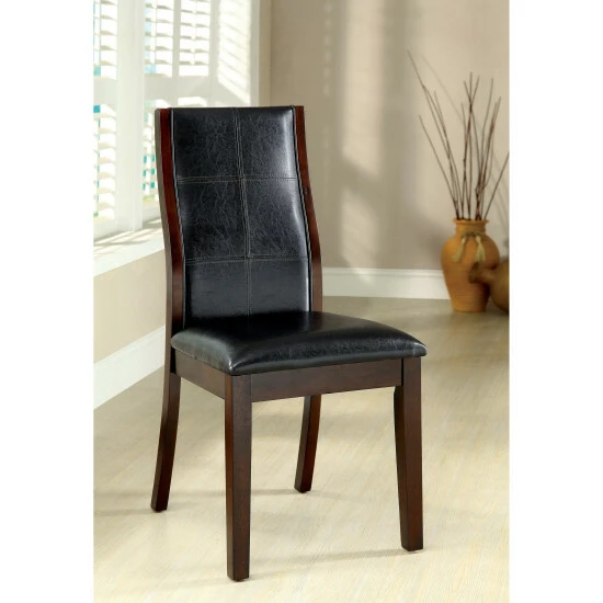 Add an elegant Italian inspired design to your dining room with these dining chairs, crafted by Furniture of America, featuring contemporary lines that will blend smoothly to any modern decor. The faux leather upholstery in black makes a focal statement contrast to the brown frame. Curvy, arched back rests and well-padded seats on these two matching dining chairs provide comfort for your guests, so they’re likely linger for long conversations over coffee. Tapered legs complete the attractive look and offer extra stability to keep you from tipping over as you lean back after a big meal. This is a terrific pair of black faux leather dining chairs for your contemporary eating space.
