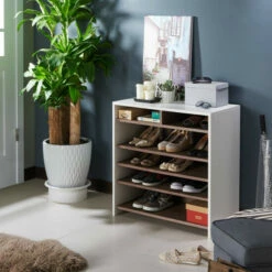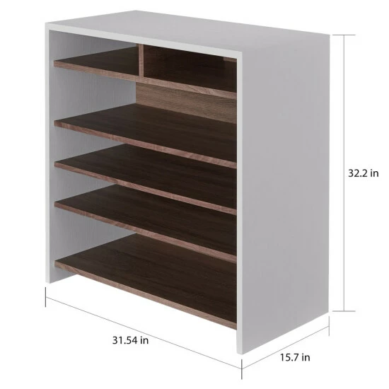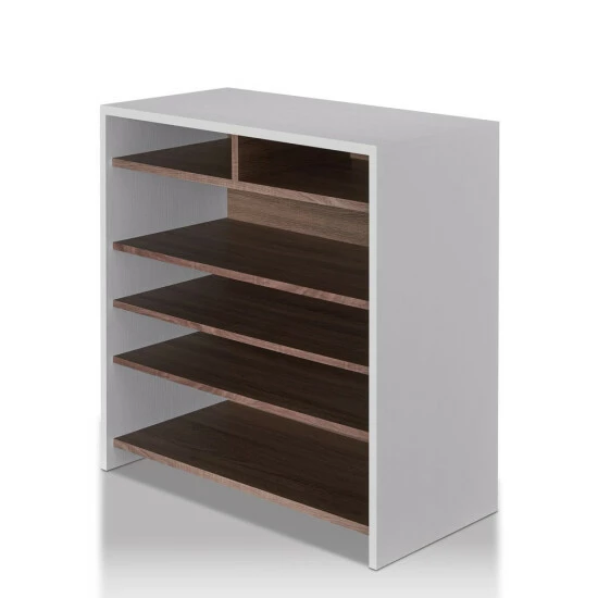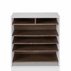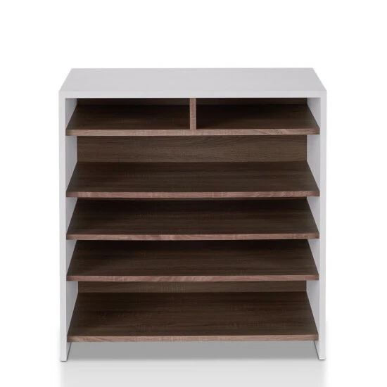 Organize the shoes in your entryway in the Tosh shoe cabinet by Furniture of America. This is a simplistic design for a shoe cabinet, featuring six shelving units to fit your shoe collection in one easy-to-access place. Open shelves allow ample airflow to your shoe collection while they are on display. while two smaller storage areas hold your keys, phone or wallet. Made from MDF and Veneer, this piece sits on block legs for stability and style. It brings a classic touch to your space with its distressed walnut color, ready to complement many different types of bedroom styles including casual settings.