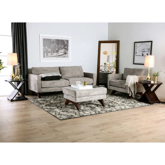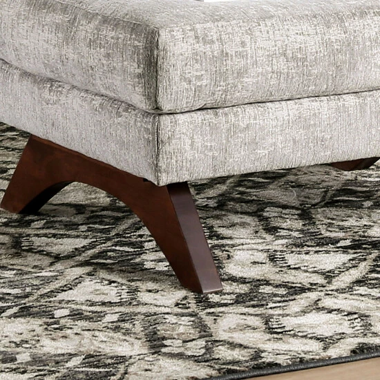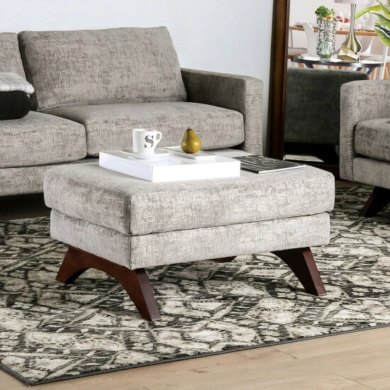 The Furniture of America Tost Mid Century Modern Chenille Ottoman has that timeless clean-lined style that makes Mid Century Modern furniture so popular to this day. The curved wooden leg base is a small detail with a lot of impact, making for an unexpected twist from the otherwise ordinary ottoman. The beautiful warm toned wood legs support the wood frame ottoman with its pocket coil springs and high density foam, creating a comfortable and convenient seating area. The distressed chenille upholstery in grey is neutral enough to work with different color schemes, and it still appears visually interesting in your living space.