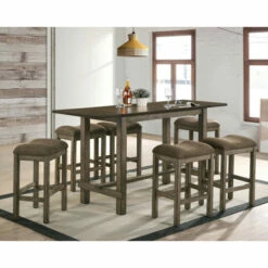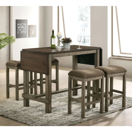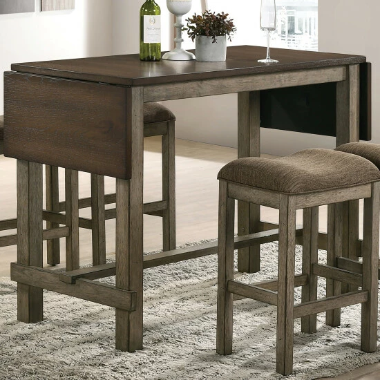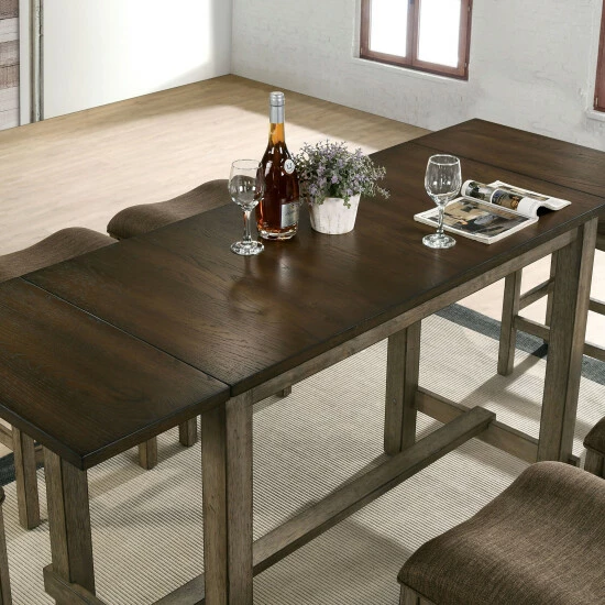 Create a casual family dining spot with this counter height dining table. Expandable with a 12-inch drop leave on each end, the table has a two-tone finish with a dark walnut top and a chestnut trestle base that adds rich character to any room.