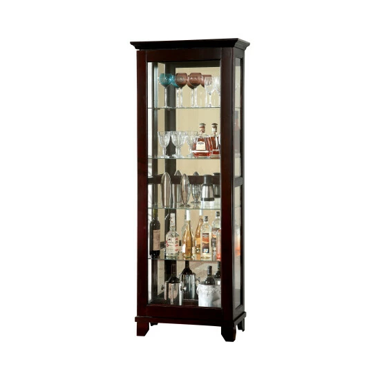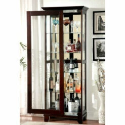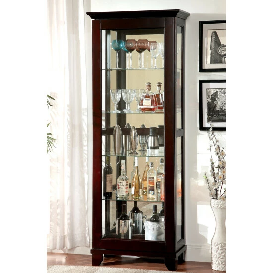 This Contemporary Walnut Solid Wood Curio Cabinet from Furniture of America creates a modern elegance with its stacked crown molding top and glamorous glass shelves made from five millimeter tempered glass for safety and security. Its unique glass sliding door, on smooth metal glides, makes access to the inner shelves of the cabinet easy and convenient. Use the spacious, sturdy shelves to create a unique entertaining center and bar, or simply to display your favorite collectibles. Finished in Dark Walnut with clean lines, this piece will be right at home however you use it, to keep your home stylishly updated.