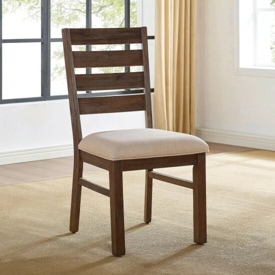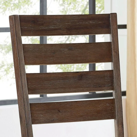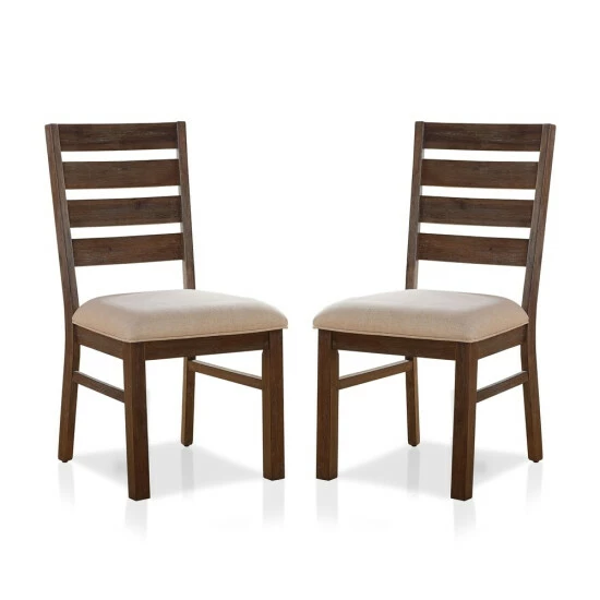 The cozy, farmhouse vibe can be easily achieved with this rustic, country style set of two side chairs. These side chairs bring incredible aesthetics to your space as they showcase your choice of finish and beautiful wood knot details for an authentic appearance. This is a sturdy set of side chairs that are made from wood and wood veneer, ensuring that it serves your family for generations. With a beautiful and attractive finish, the angled legs play off the country vibe for a warm, inviting atmosphere. These rustic dining chairs enhance the appearance of your dining space while bringing a functional option for extra seating.
