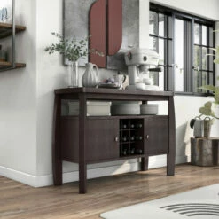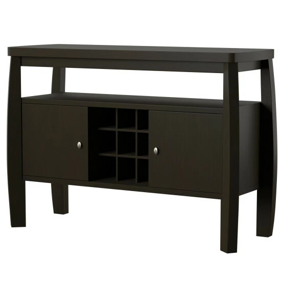 Keep your dishes, bar supplies, and more organized with this stylish buffet table. This table features a wide top with an open shelf beneath it, as well as two closed cabinets and an open wine bottle shelf. The wine bottle shelf features compartments for up to nine wine bottles.