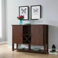 Designed for function and elegance, this 2-cabinet dining server features a walnut wood finish with grain details that impart warmth and character. Its exposed framework design is an understated touch that brings dimension without overwhelming. Equipped with plenty of practical storage, the buffet features two cabinets with ample interior storage.