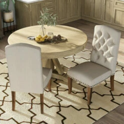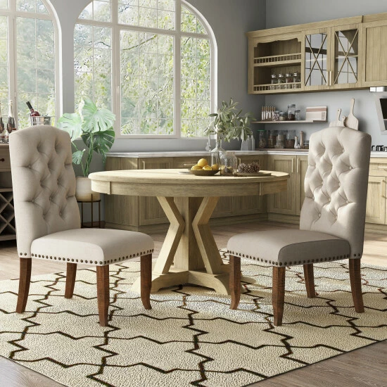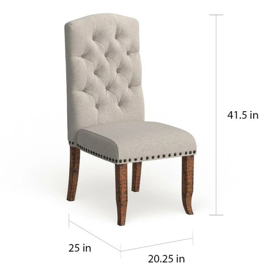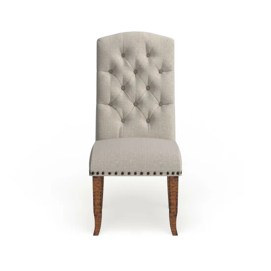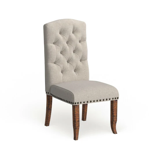 With a chic nod to country manor sophistication, this set of traditional dining chairs makes for a cozy addition to any space. The upholstered armless design is wrapped in soft fabric over a firm foam interior for optimum support, and sturdy rustic pine legs promise stable seating. A charming camel back backrest is highlighted with button tufted accents for extra texture and dimension. Dark nail head base and wooden legs for a 225 pound weight capacity.
