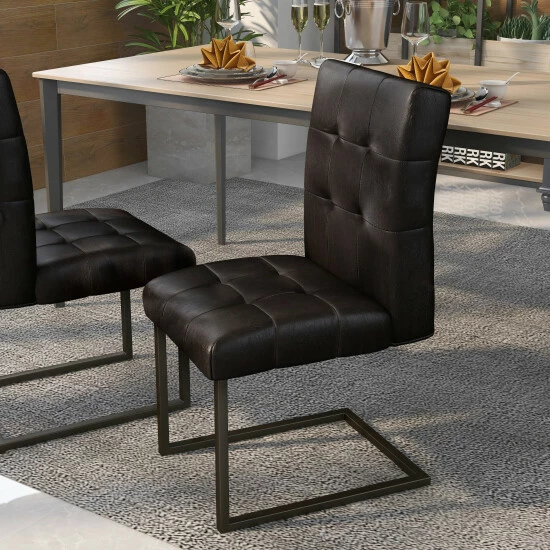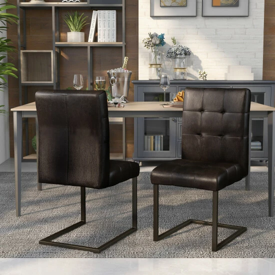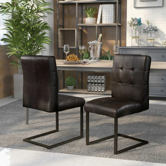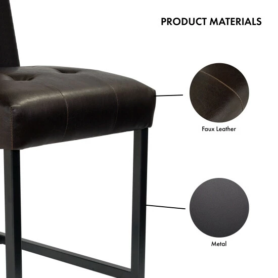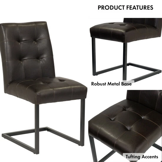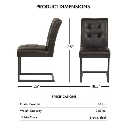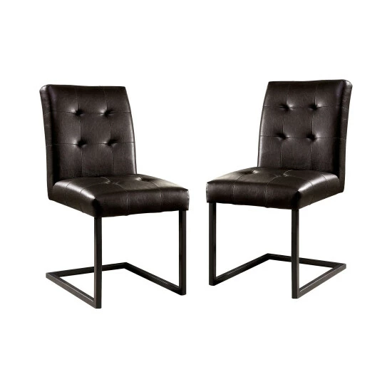 Transform an elegant dining area with this set of two rustic side chairs from the Furniture of America Tver collection. Showcasing a metal frame construction with an open and sleek, U-shaped metal base in a gun metal finish, each of these chairs offer complete comfort and a sturdy and stable place to rest during meals. Wrapped in a rich brown faux leather upholstery, each padded seat offers a smooth surface and a transitional look to match your current dining table and modern farmhouse style home. Each seat also features button tufting and structured stitching that lends to their handsome look. Also part of the Tver collection is a matching dining table to complete your dining area.