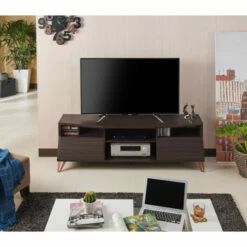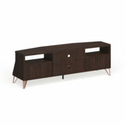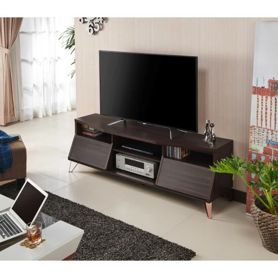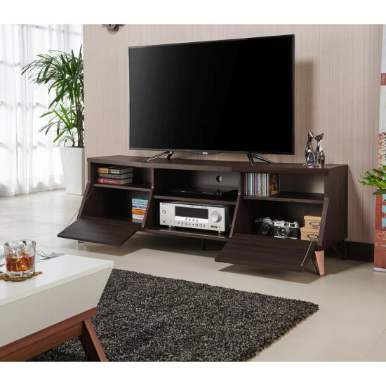 Embrace a trendy Mid Century Modern touch by adding this Umer 63 Inch TV Stand to your den or family room. The understated angled front with hinged drop down doors and the angled metal support legs echo the signature style of that era, while the dark wood finish keeps things fresh and modern. With two of these doored spaces in this piece from Furniture of America, you will find ample storage for books, movies and other items to reduce clutter. The two open center shelves provide for media components with openings in the back of both shelves for wire and cable management to keep it all looking sleek and modern.