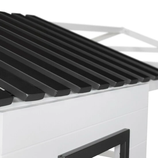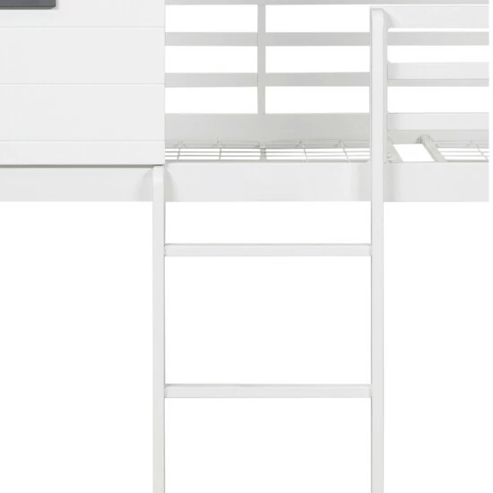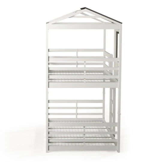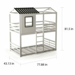 Inspire imagination and fun in your child with this Vaia twin-over-twin metal bunk bed. The bunkbed is crafted with a white metal frame, an integrated ladder, and slatted guard rails that ensure safety. The two-tone wood veneer playhouse over the top bunk has built-in windows and a peaked roof, making this bunk bed great for both sleep and play.