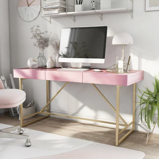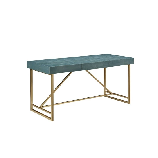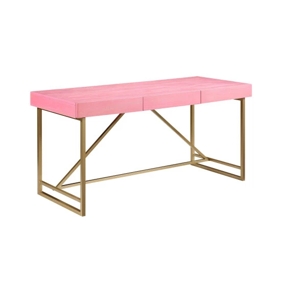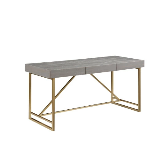 Work in style with this contemporary writing desk from Furniture of America. This desk has a geometric goldtone metal base that gives it a glam, vintage look, and is complemented by a wood veneer top in your choice of color. Three drawers provide handy storage space for office supplies.