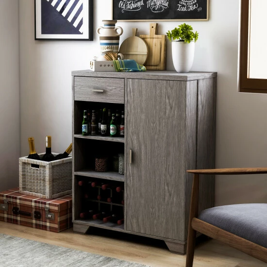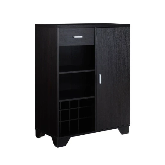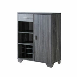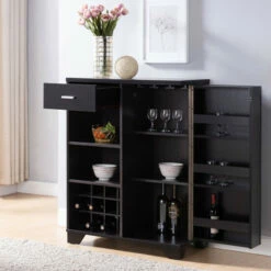 Keep all your wine and drinking supplies in one spot with this convenient bar cabinet. Store up to twelve bottles of wine in the integrated wine rack, and slide eight wine glasses onto the built-in glassware rack for convenient access. This sleek bar cabinet makes it easy to serve drinks at a moment’s notice.