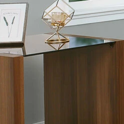 Bring the natural energy of wood and the elegance of modern design to your living room with this contemporary end table with a black glass top. The table includes an open shelf in the base while solid sides define its cubic profile.
