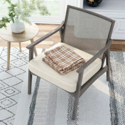 Put the finishing touches on a casual and comfortable sitting area with this contemporary accent chair. It pairs a thick, plush seat cushion with a light, airy frame and an open, woven synthetic cane back that brings a hint of tropical ambiance.