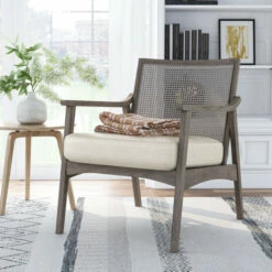 Put the finishing touches on a casual and comfortable sitting area with this contemporary accent chair. It pairs a thick, plush seat cushion with a light, airy frame and an open, woven synthetic cane back that brings a hint of tropical ambiance.