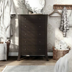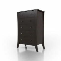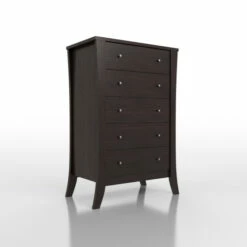 Ideal in a transitional master suite or contemporary home, this espresso-finished, five-drawer chest offers a bowed silhouette that extends into dramatically flared feet. On each of the five ample drawers, situated on smooth metal glides with stoppers, shiny nickel hardware brings a striking contrast.