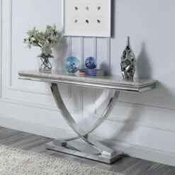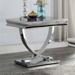 Embrace modern elegance with the sophistication of this three-piece living room table set. Each features a gorgeous white faux marble top perched on an elegant, polished chrome finish base with cool crossing curves for support.