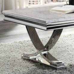 Embrace modern elegance with the sophistication of this contemporary metal coffee table. Each features a gorgeous white faux marble top perched on an elegant, polished chrome finish base with cool crossing curves for support.