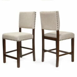 Elevate your gathering space, with this set of two upholstered, counter chairs, complete with padded, foam-filled seats and backrests that cushion your body. Their soft, beige linen upholstery brings a pop of elegant neutrality, as solid wood frames with built-in footrests offer robust support.