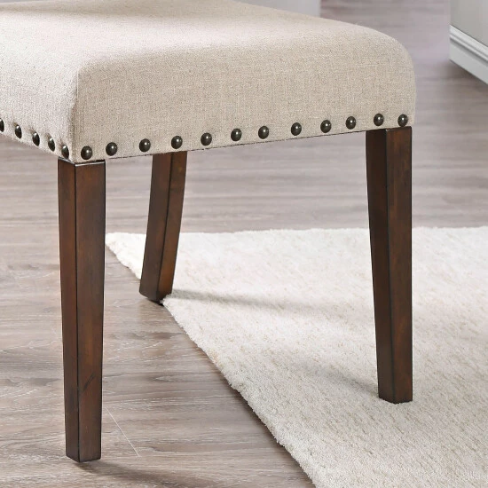 Give your home a touch of rustic allure with this two-tone set of two transitional side chairs. The cool ivory fabric upholstery is a lovely contrast to the brown cherry wood legs and frame for a handsome two-tone appeal. Enjoy comfy seating on the cushioned seat and curved back accented in nailhead trim for added rustic appeal. With solid wood legs taper in the front and slightly flare in the back, this chair is perfect for pulled up to a dining table or as additional seating space in a living room or den.