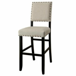 Encourage good times you’ll remember forever when you and yours sit around this counter-height dining set from Furniture of America. Each piece is built of solid wood in a timeless antique black finish that features exposed wood grain details for a handsome rustic look. The table features solid block legs and a center support beam for stability, while the chairs are wrapped in ivory linen-like fabric trimmed with rustic nailheads. The set conveys a warm, homey appeal that you’ll enjoy for a long time to come.